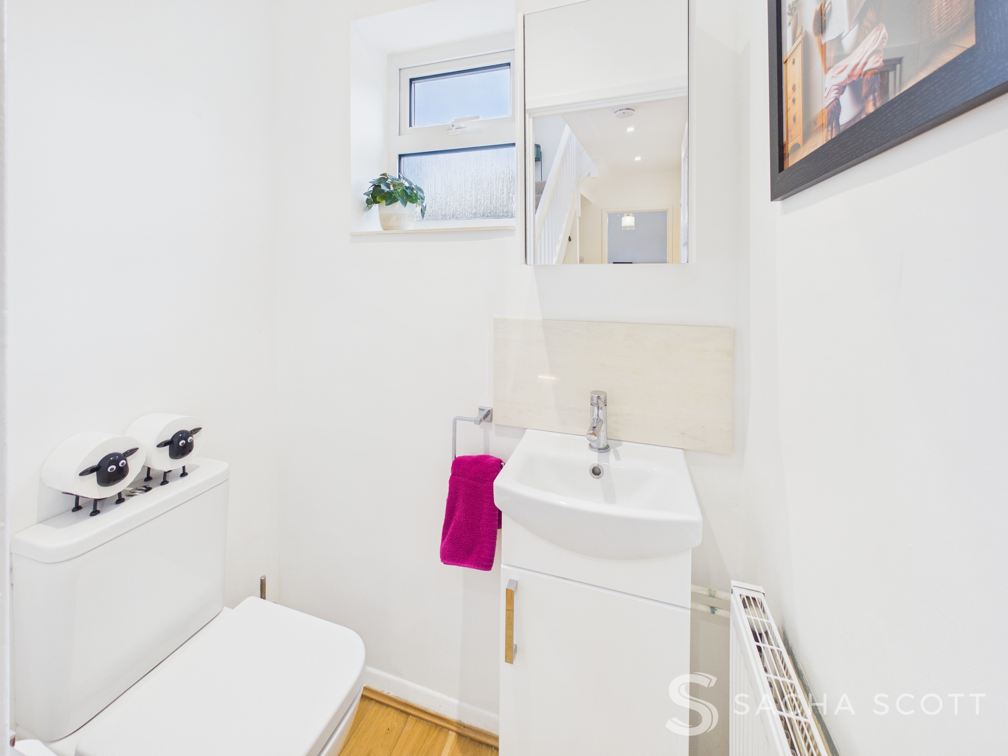 Neutrally presented the ground floor guest WC offers a vanity sink, WC and radiator.