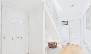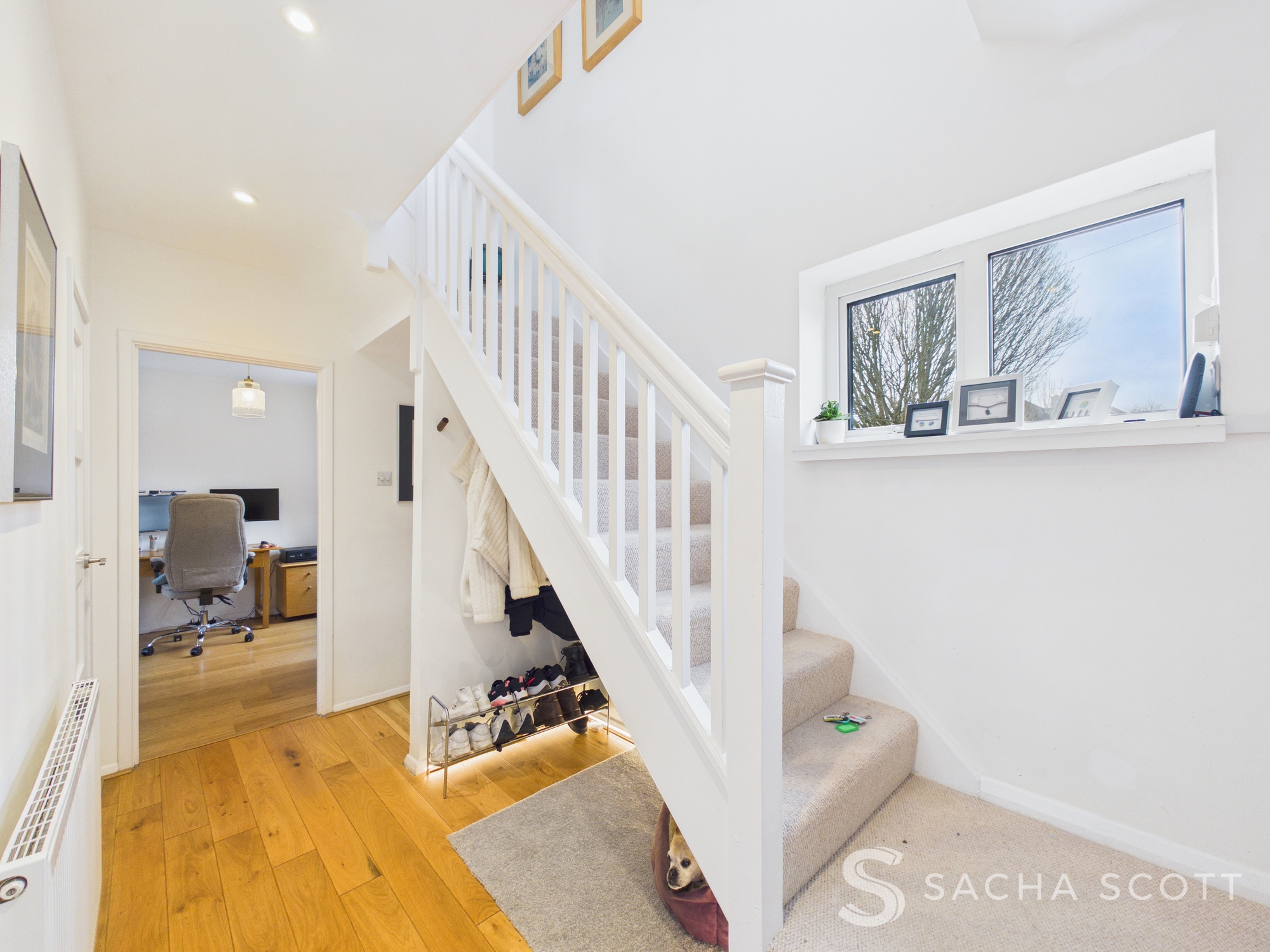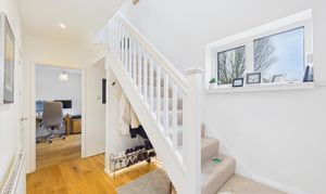 Setting the tone for what truly is a beautiful family home, the entrance hall offers warm wood flooring, neutral decor, storage cupboards and under stair storage space.