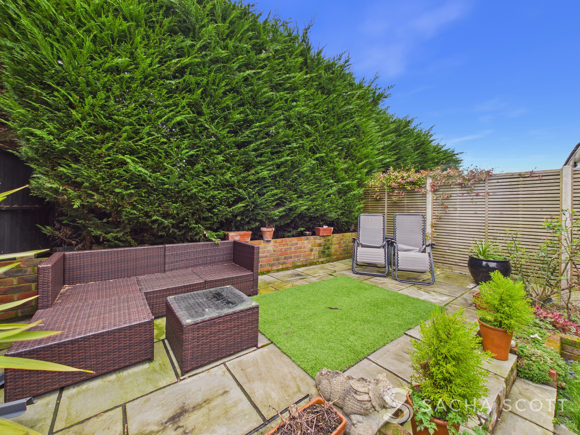 This sunny landscaped garden is north west facing but benefits from sun for most of the day. Easy to maintain, it measures approximately 40ft x 25ft mainly laid to lawn, with a central paved pathway leading to steps up to a paved sitting area at one end of the garden, and a patio area to the rear of the house, with planters, garden lighting, garden tap, shed and side access to the front driveway.