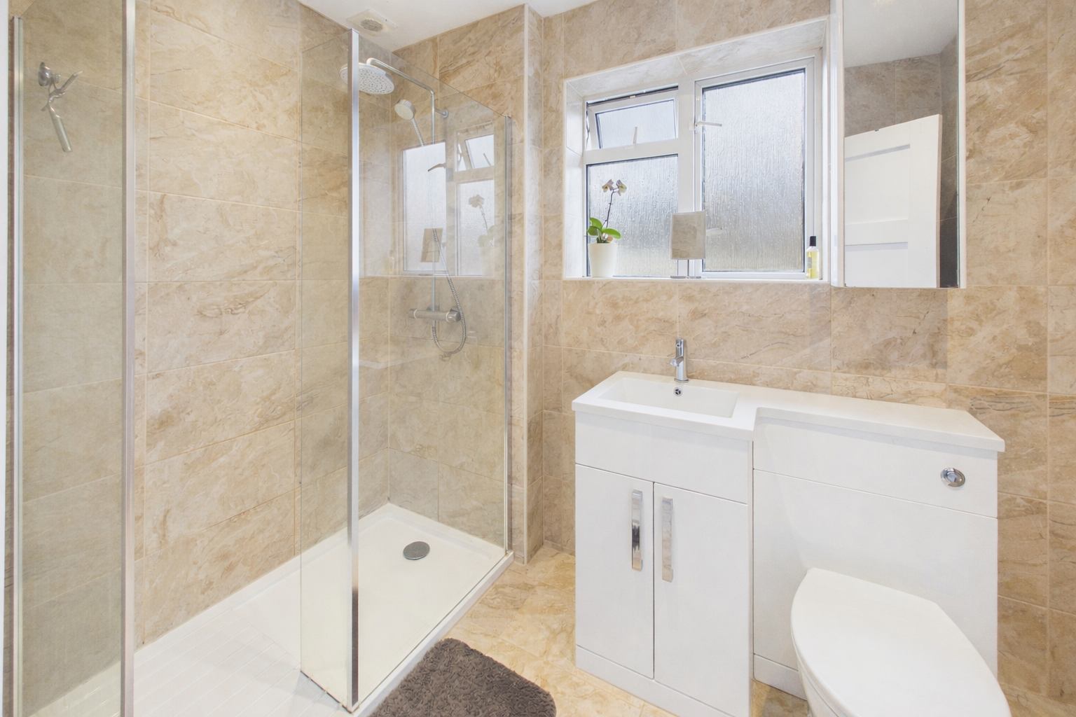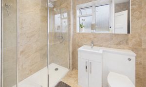 Fully tiled, this beautiful bathrooms offers a large shower cubicle, combination WC and sink unit and a heated towel rail.