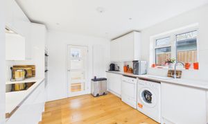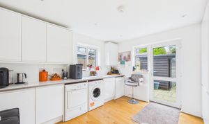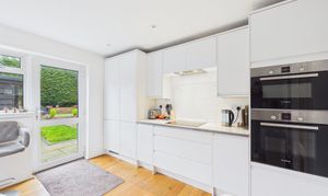 Offering access to the private, easy maintenance garden to the rear, this generous kitchen offers plenty of storage and work surface space, warm wood flooring, neutral decor and room for all expected appliances.
