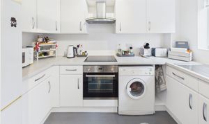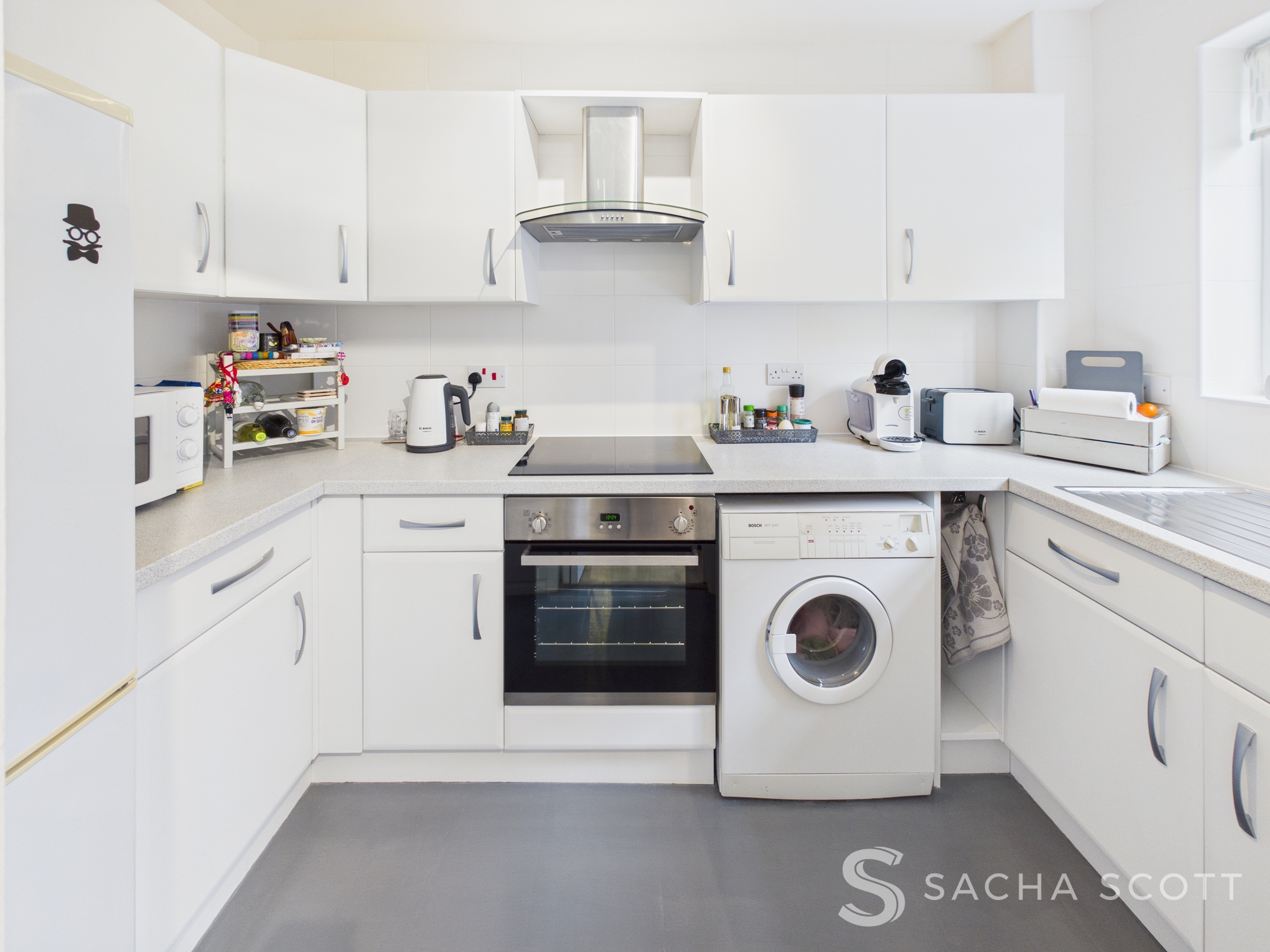 Modern and bright, the kitchen offers ample storage and work surface space and room for both a fridge freezer and washing machine.