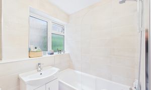 Fully tiled, the bathroom offers a shower over bath, vanity sink with storage, WC and a centrally heated towel rail.