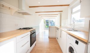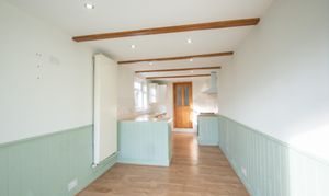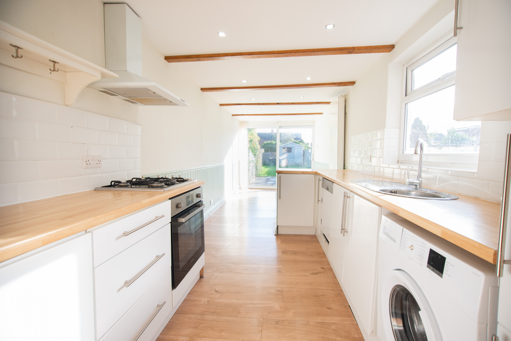 With laminate flooring, integrated hob and oven, integrated dishwasher, extractor fan, sink and tap, laminate worktop, radiator and doors to the garden.