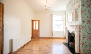 With laminate flooring, fire place with detailed surround, radiator and arch way to living room.