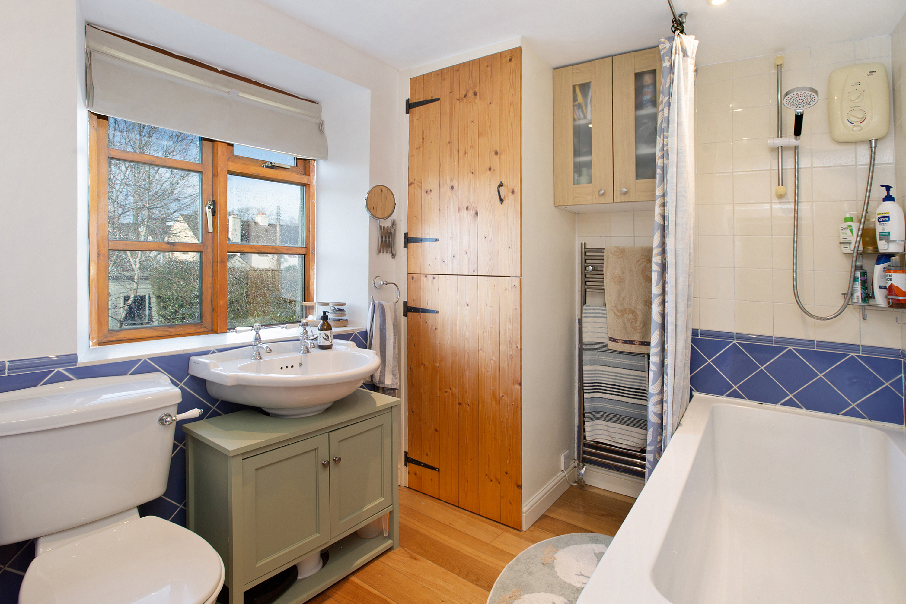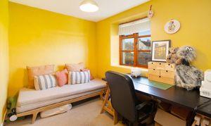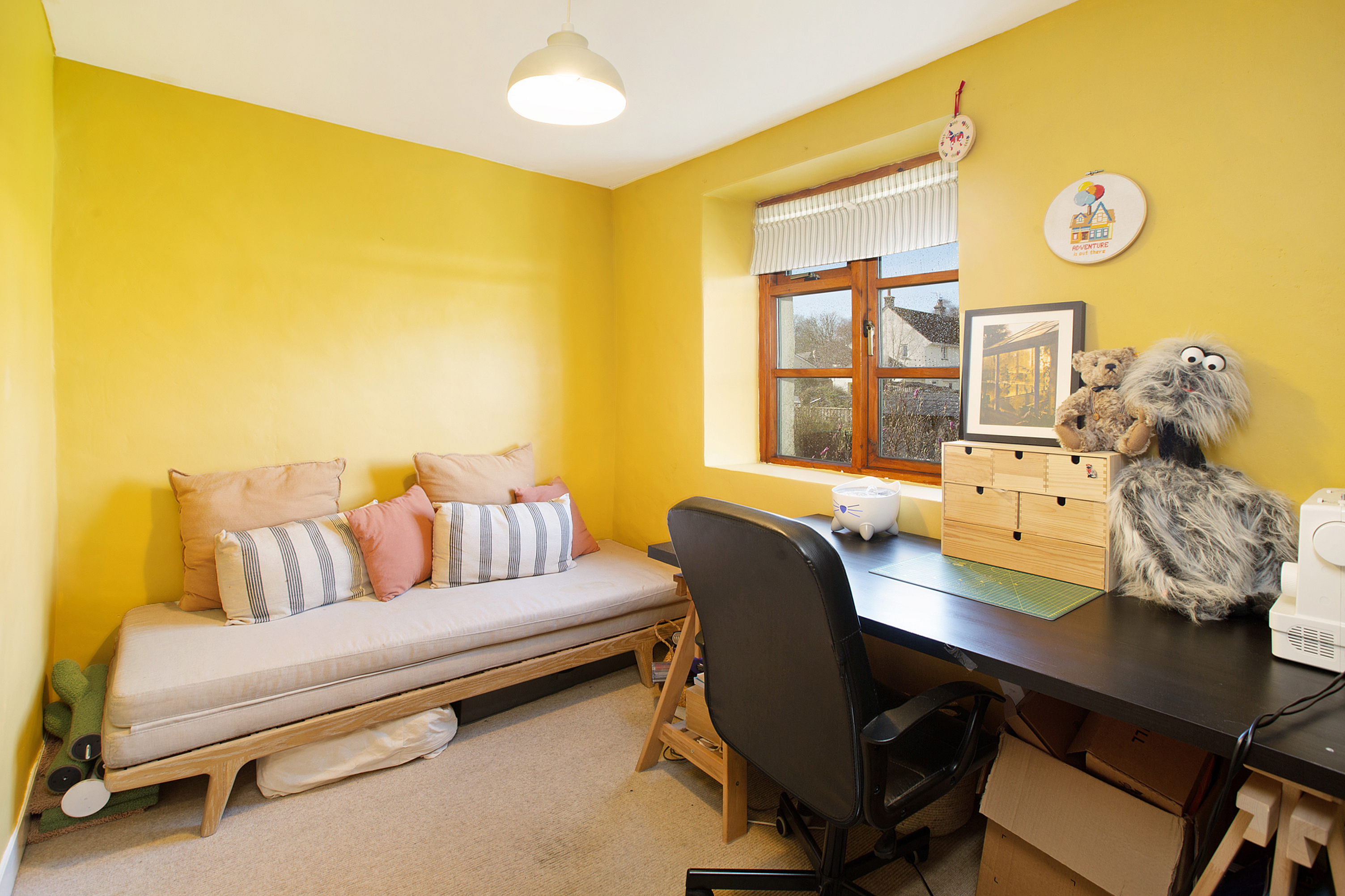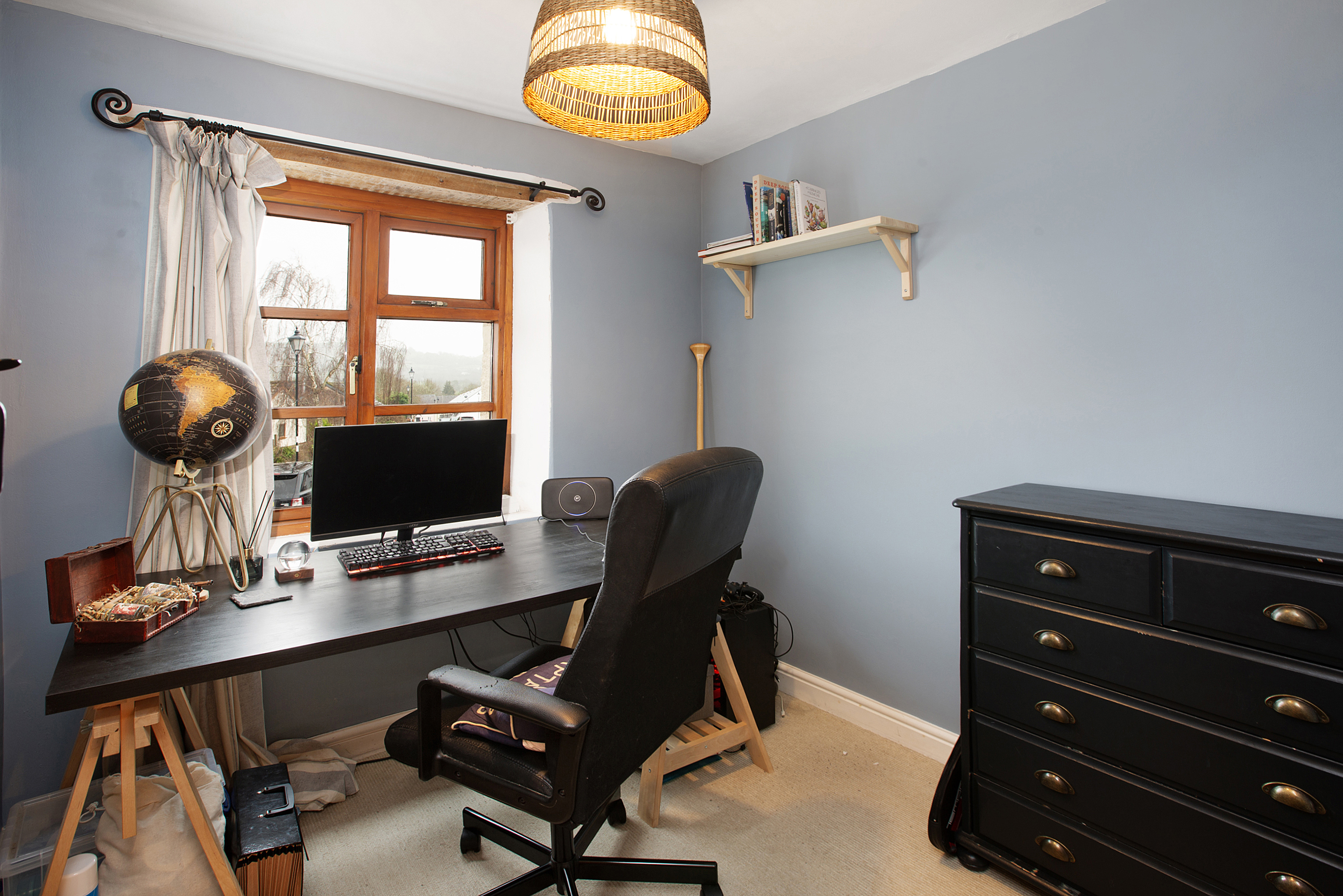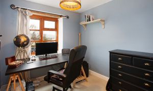 Upstairs, directly opposite the staircase, is a single bedroom currently used as an office/study, though it could equally serve as a hobby room or nursery. Further along the landing is the master bedroom, thoughtfully arranged and featuring a decorative fireplace this room is a great sized double. Nearby is the third bedroom, currently hosted as an additional office this room have the lovely views over the rear garden and further countryside. Situated next to the third bedroom is the main family bathroom, which includes a WC, sink basin, cupboard storage, and a bath with shower.