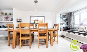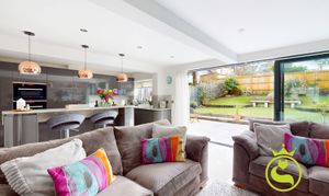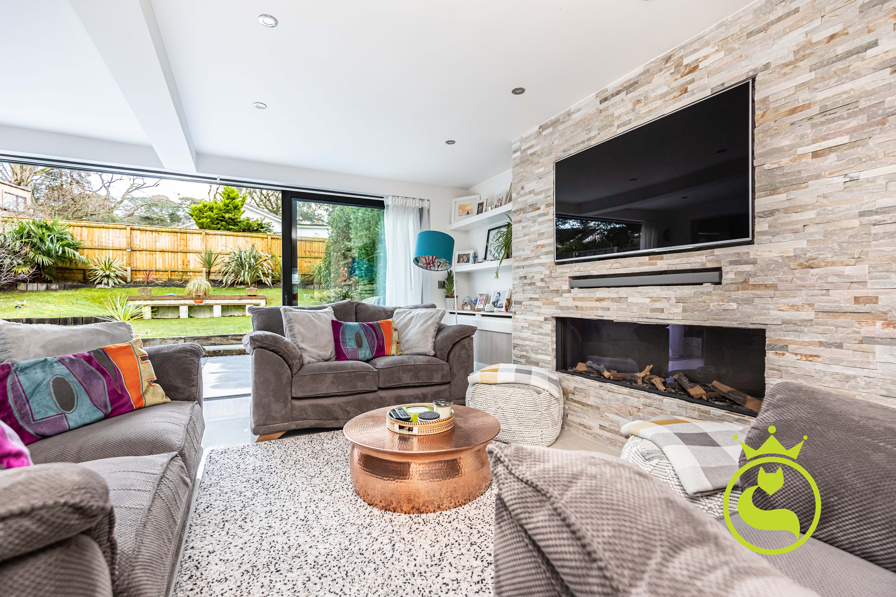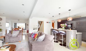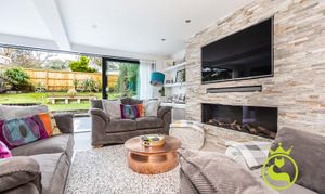 The heart of the property is a stunning open plan kitchen/diner/family room, seamlessly blending style with practicality to create the ultimate hub for entertaining, relaxing, or working from home. The kitchen features sleek cabinetry and integrated appliances, a central island makes meal preparation a delight, while the spacious lounge and dining zones offer ample room for gatherings or quiet evenings. The lounge area comes with a featured tiled stone effect media wall with contemporary gas fire and shelving either side. The dining area offers plenty of space for dining furniture with a built in window seat and storage under. This room has been meticulously design to a high specification with glossy porcelain tiling throughout and tasteful decor and aluminum sliding doors lead to the garden.